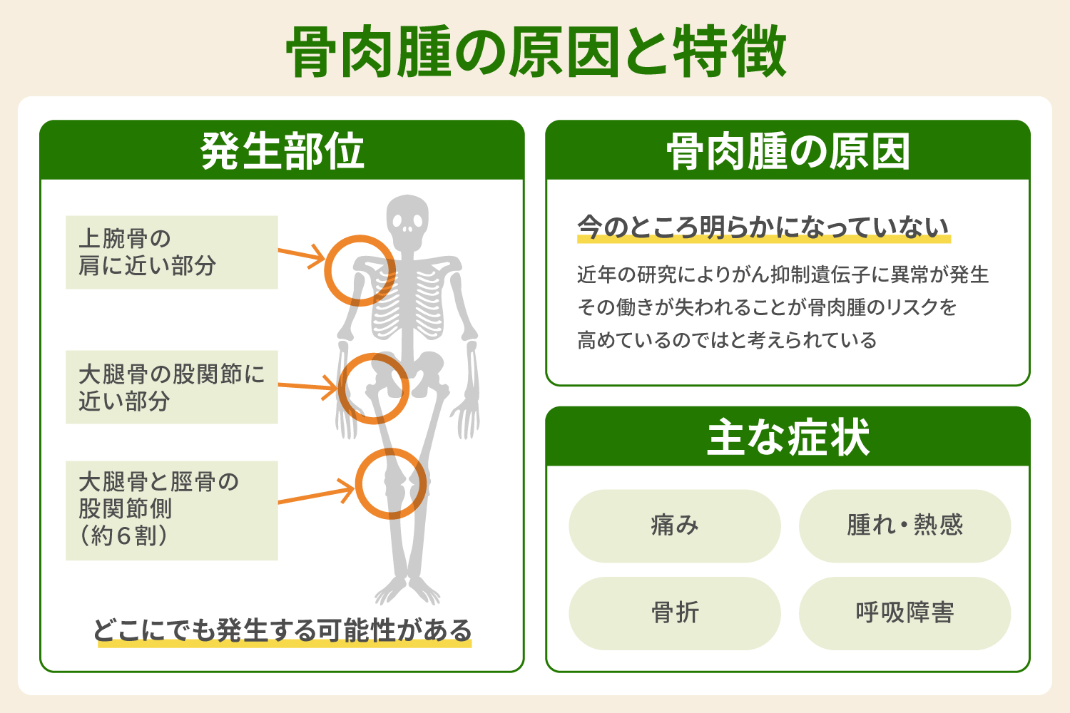 ここでは骨肉腫の原因および、がんの発生部位・症状といった主な特徴について説明します。