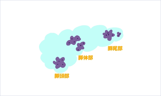 膵臓は胃の後ろにある、長さ約20cm、厚さ約2cmの臓器です。形状は細長く、おたまじゃくしのような形をしています。動いているときと休んでいるときで色が変わることも膵臓の特徴です。