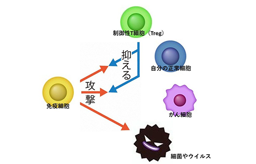 免疫が抑えられてしまっては困るものの代表は病原体とがん細胞などの異常な細胞です。近年、がん細胞への免疫応答を抑える免疫チェックポイントを阻害する治療が登場し、がん治療においてブレークスルーをもたらしました。今後は、過剰な制御性T細胞を抑える治療法も、がん治療において有望な手段になるものと考えられます。