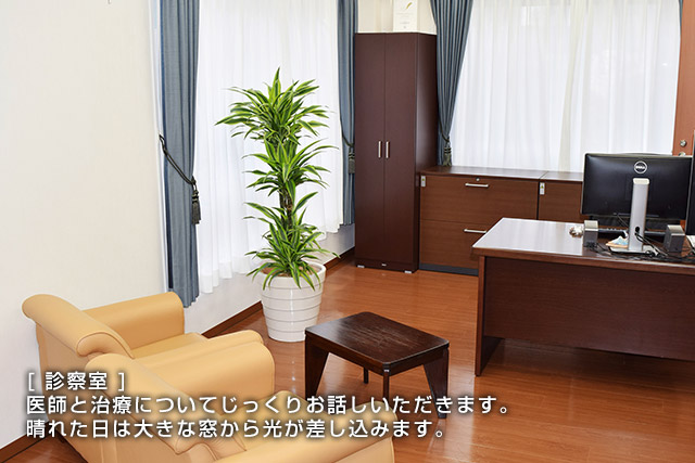 十分な広さをもつ診察室の中にはソファーがあり、患者さんだけでなくご家族もご一緒に、ゆっくり時間をかけて医師と治療方針を相談していただけます。