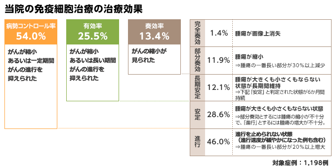 ここでは、当院で免疫療法(免疫細胞治療)をお受けになった患者さんの治療効果・成績についてまとめています。当院では患者さん・ご家族にご納得の上で治療をお受けいただくため、長年の治療データを分析し、客観的なデータとして公開しています。