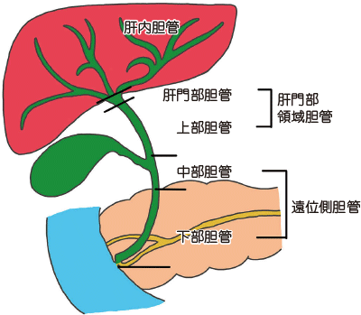 さらに肝外胆管がんは、発生した部位によって肝門部領域胆管がんと遠位胆管がんに分類されます。