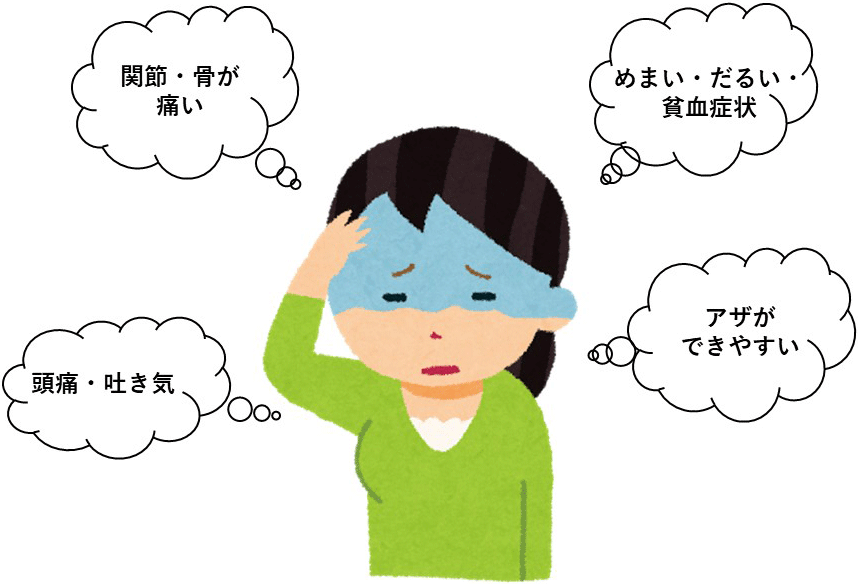 - ●貧血症状(動悸、息切れ、めまい、だるさなど)