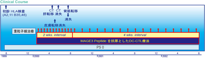 症例は44歳の女性で鼻腔のメラノーマを診断され某大学病院で手術を勧められた。後遺障害から手術を辞退され当院を受診した。免疫細胞療法で根治を得ることは困難であることを説明し、重粒子線の適応について放射能医学研究所病院へ紹介した。その時点では遠隔転移も無く、適応があることから約三ヶ月にわたって重粒子線治療を行った。その後、遠隔転移再発するリスクが高いことから、全身療法として当院で免疫細胞療法を行った。免疫細胞療法としてはヒト白血球抗原(HLA)を調べたところ、HLA A2であった。メラノーマ抗原であるMAGE3のHLA A2上に、提示されるエピトープであるPeptideを合成、それをパルスした樹状細胞を作成した。この樹状細胞と末梢血単核球をexvivoで混合培養することで、CTLを誘導して活性化自己リンパ球療法を行った。 2000年2月より、2週間間隔で12回の治療を行い、その後は約4週間間隔で2002年7月まで、合計、31回の治療を行った。経過中、および治療開始時点より肝転移、皮膚、皮下転移が確認されたが、本治療経過中に肝転移、皮膚、皮下転移がそれぞれ消失している(図1)。 本症例は、一時、寛解した肝転移が23ヵ月後に再燃をきたすが、化学療法などを受けることなく良好なPSを維持し免疫細胞療法を開始から1039日間生存できた。